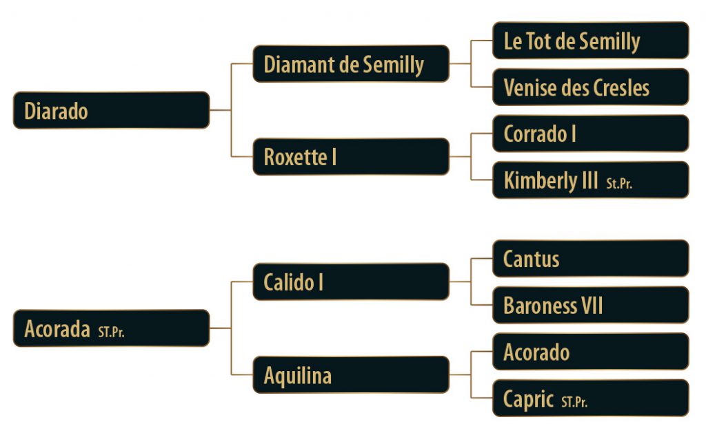 Der Vater Diarado, seines Zeichens Kör- und HLP-Sieger, holte Bronze auf dem Bundeschampionat der fünfjährigen Springpferde und ist inzwischen bis Drei-Sterne-S-Springen erfolgreich. Er ist einer der gefragtesten Springpferdevererber der züchterischen Gegenwart: 25 der noch jungen Nachkommen sind bereits S-erfolgreich, 38 Söhne erhielten ein positives Körurteil. Der Mutervater Calido I ist der einflussreichste Sohn des großen Cantus und einer der berühmtesten Springpferdelieferanten weltweit. Er bringt reihenweise Spitzenpferde, 72 gekörte Söhne und 295 S-Springpferde.