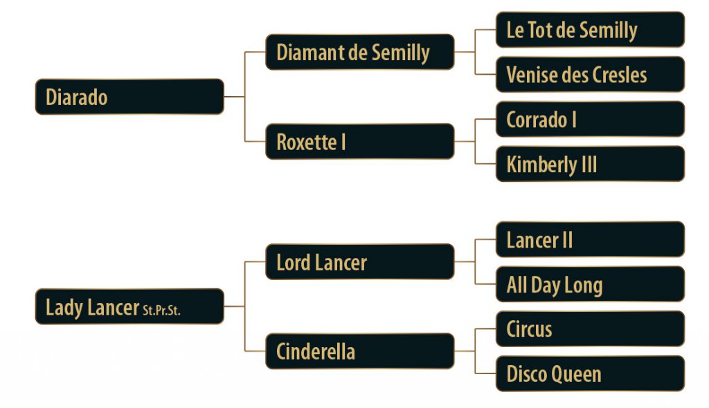 In seinem Pedigree stehen die Weltvererber der internationalen Springpferdezucht, wie Diamant de Semilly – Corrado I – Contender - Lord Ramiro. Der Muttervater Lord Lancer ist ebenso im internationalen Parkett erfolgreich. Aus dem Mutterstamm entspringen mehrere Staatsprämienstuten sowie zahlreiche Auktionspferde.