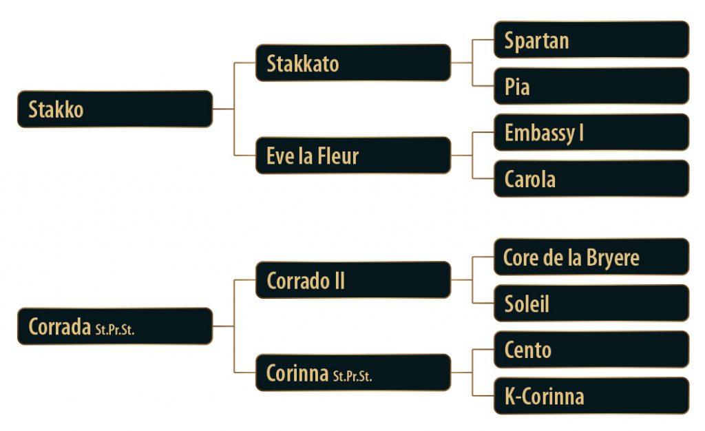 Der Vater Stakko war bis Klasse S unter Justine Tebbel erfolgreich und nun in den USA in siegreich. Stakko stammt ab vom einstigen Bundeschampion Stakkato, der über Jahre die FN-Zuchtwertschätzung Springen beherrschte.